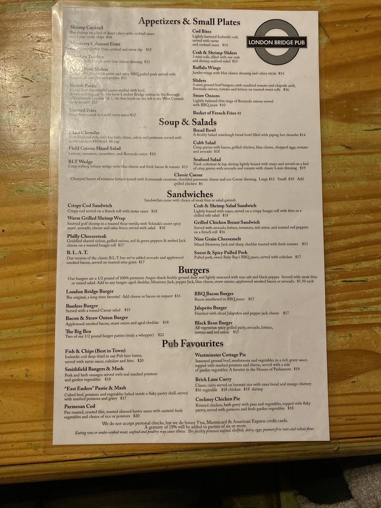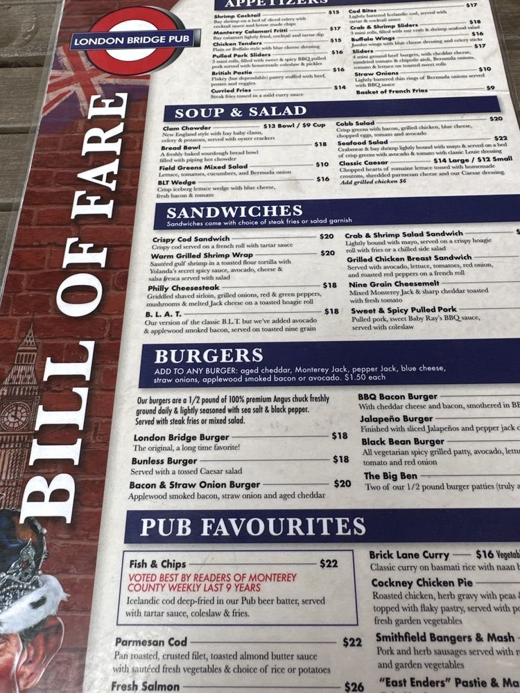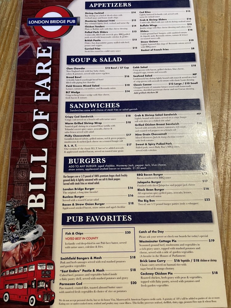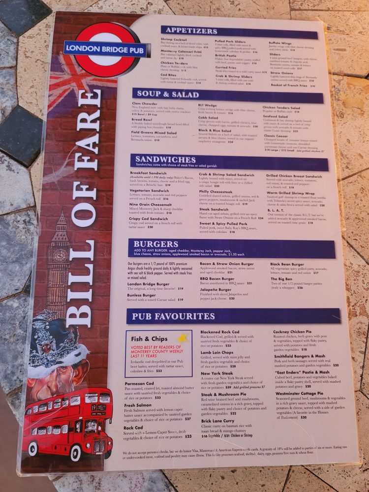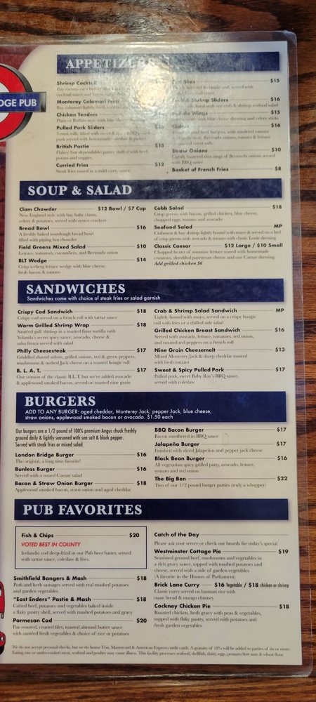 London Bridge Pub, located in Monterey, CA, offers a taste of England with dishes like pasties, fish and chips, and steak and mushroom pie that transport you to a traditional English pub experience. The menu is perfect for Brit expats looking for authentic flavors, as mentioned by satisfied customers. With a cozy waterfront vibe and a full bar, it's a great spot for a casual meal or happy hour. The staff is friendly and accommodating, making you feel right at home. Don't miss out on their black and blue salad, fish and chips, and curly straw onion rings. Overall, London Bridge Pub is a must-visit for classic British fare in a charming setting.